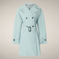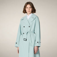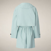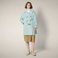 L’impermeabile da donna modello Livia dà colore ai giorni più grigi con la delicata nuance azzurra. Il taglio doppiopetto, la cintura regolabile in vita e i bottoni sui polsi definiscono la silhouette di ispirazione trench, mentre il logo tono su tono completa la manica sinistra. Nato per la pioggia estiva, veste leggero e impeccabile anche a cielo sereno.